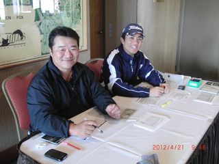 | 2012年初回幹事は役員の後藤さん(左)と有田さん(右)。幹事で練習ができないからと、朝7時に来て練習していたという後藤さん。気合が入ってます。どすこい! | |