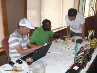 | 只今集計中。今月の幹事さん(倉田さん&アンソニーさん)と有田幹事長 | |