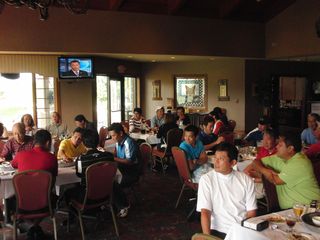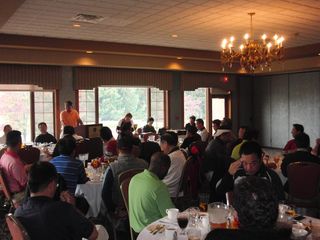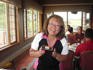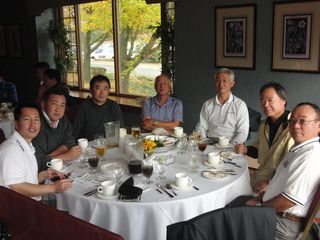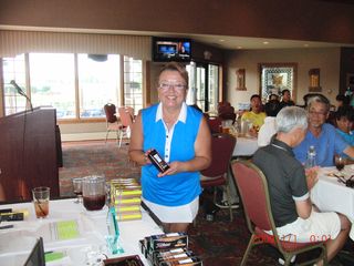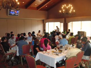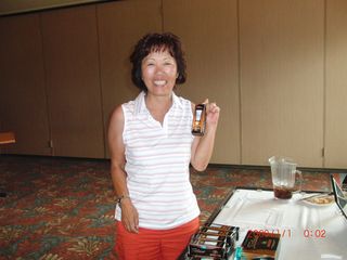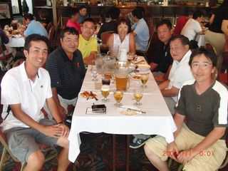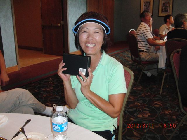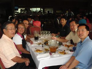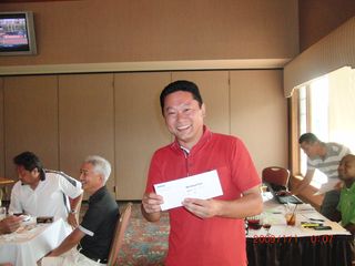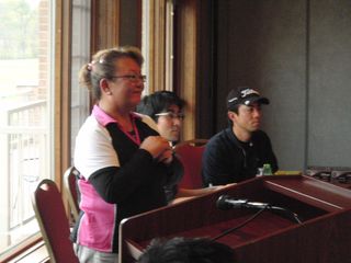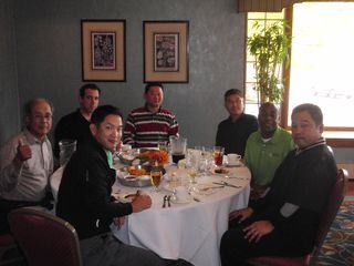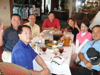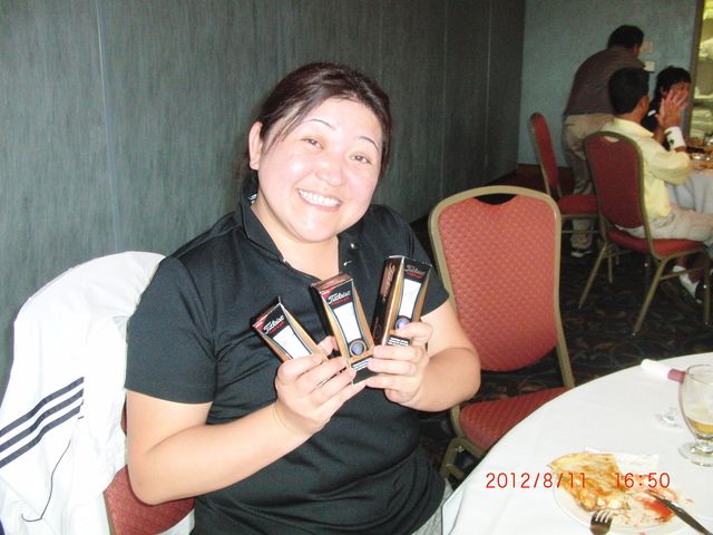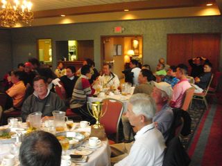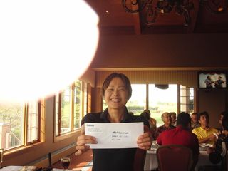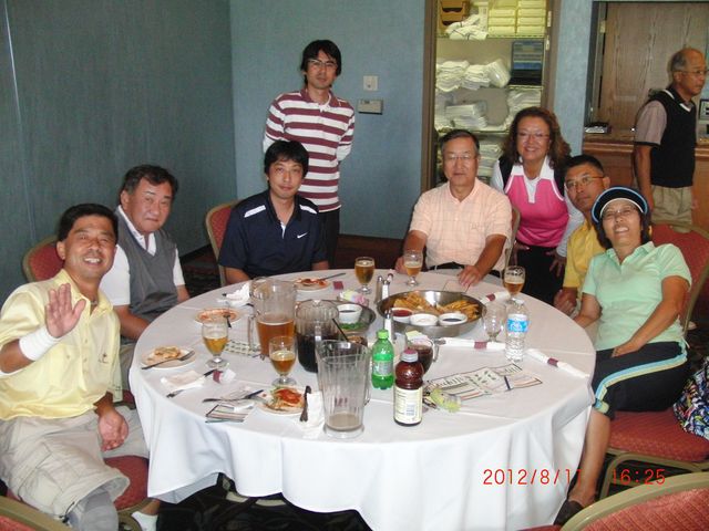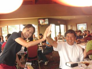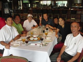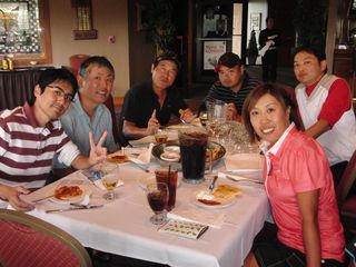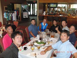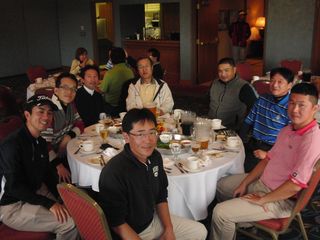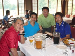 | 懇親会テーブル#5 右手前の女性、最近優勝の女神と騒がれている高岡さん。9月シカゴ会優勝の前畑さん、 8月ミシガン会優勝の西沢さん、9月ミシガン会優勝の渡辺さん、みんな彼女と一緒の組で回っているんです! あげまん!? 自分のスコアを良くしてくれる男神を探しているそうです。 | |