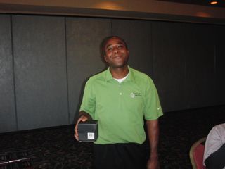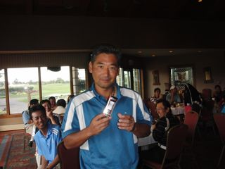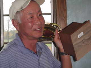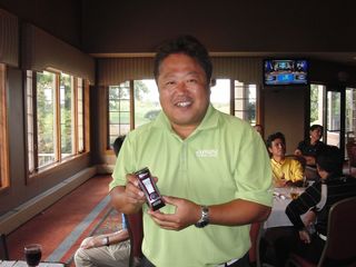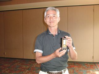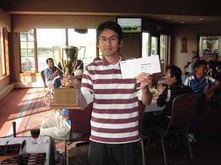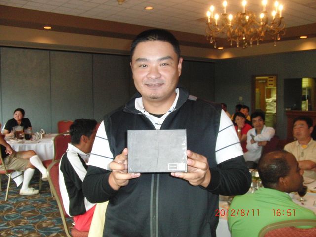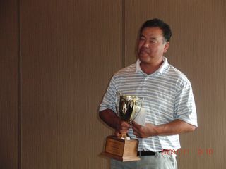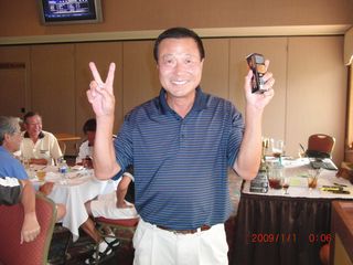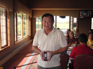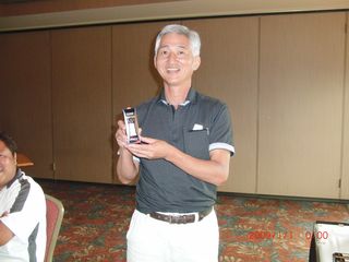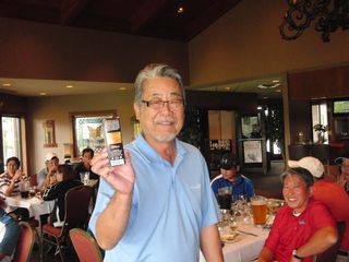 | 同点3位だったのにHDCPで敗れて4位となったシカゴ会会長の遠藤さん。でも#3のニアピンはゲットしました! | |