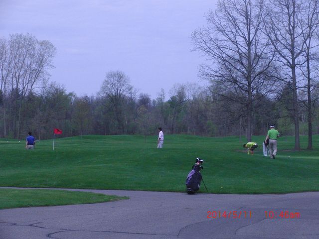 | 練習グリーンが閉鎖されているので、18番ホールのグリーンで練習を。 | |