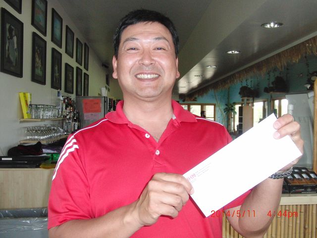 ![]() | 3位入賞の渡辺さん。2位の芥川さんとは同ネット同HDCPで年齢差で負けました。頑張って年を取りましょう。渡辺さんは4月度にも4位に入賞しており、今年のグランドチャンピオンに期待がかかります。 |