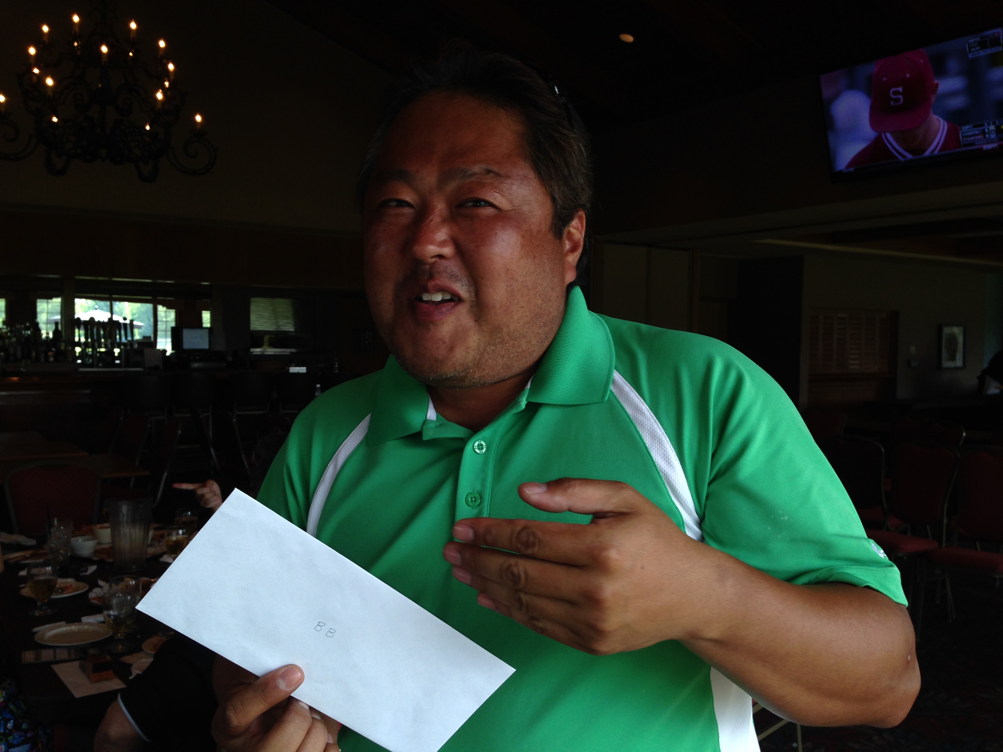 | 先月BB幹事となった上田さん、今回は打って変わって5位入賞! 6位のアンソニーさんとは1点差。BBで一つ増えたHDCPを活かしました! アンソニーさんも惜しかった! | |
