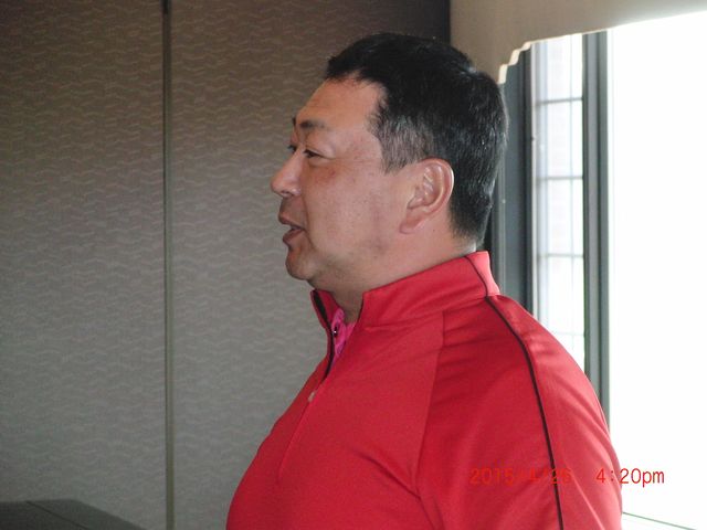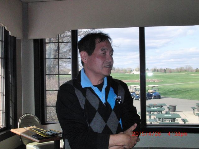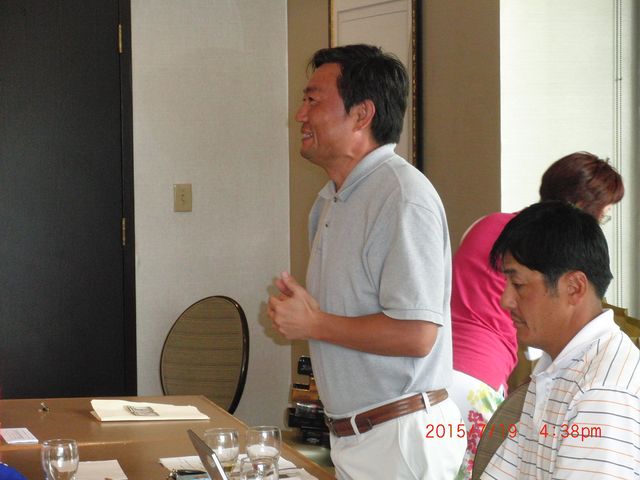 | 下田会長挨拶。皆様の拍手でキャンディさんの新役員が承認されました。99%の確率で来月帰任になるとのことで、またミシガンがゴル吉を一人失いそうです。 | |