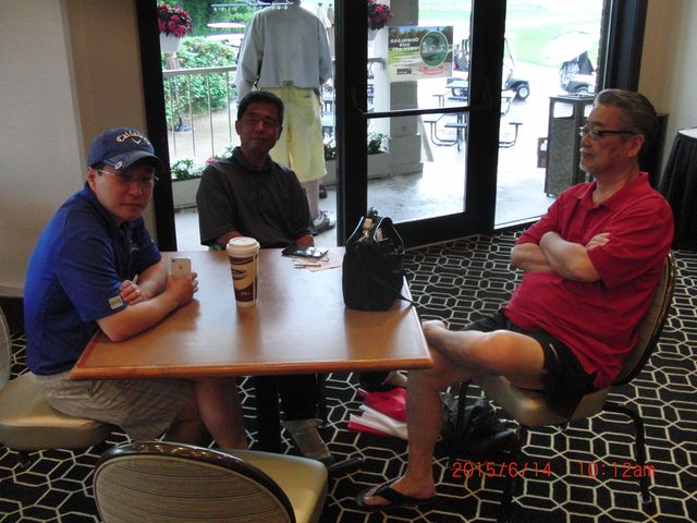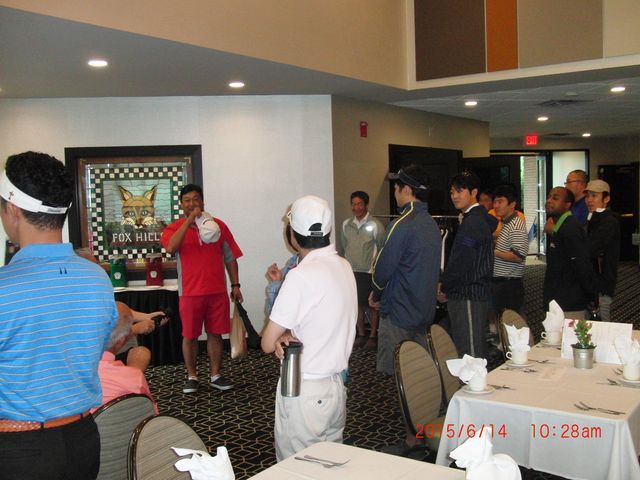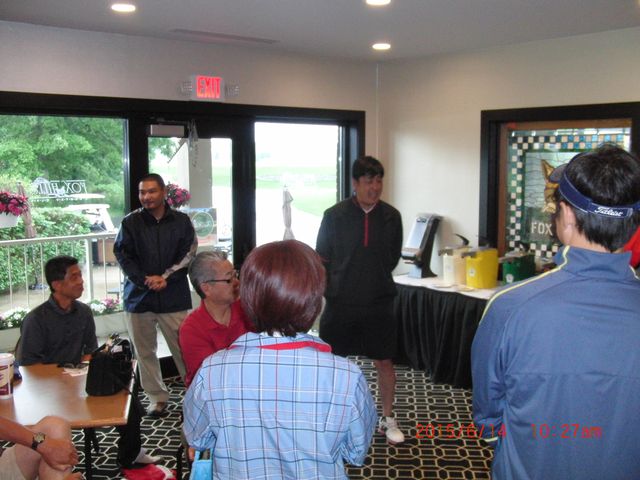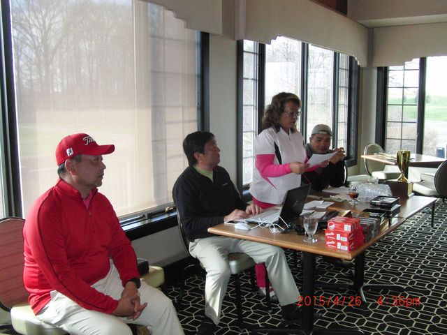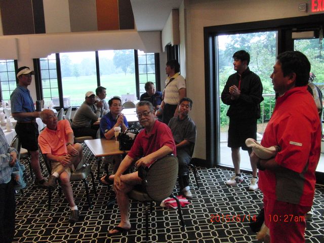 | フェアウェーとグリーンには水たまり、午後4時まで雨の予報、ということで、下田会長から中止の発表がありました。 | |