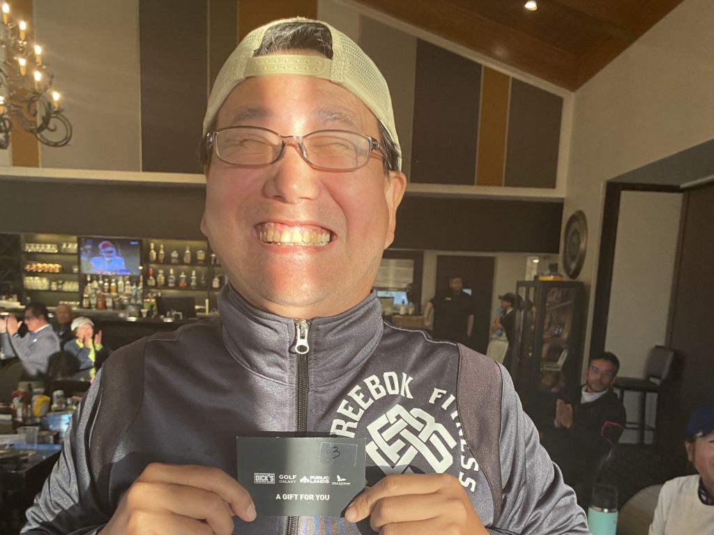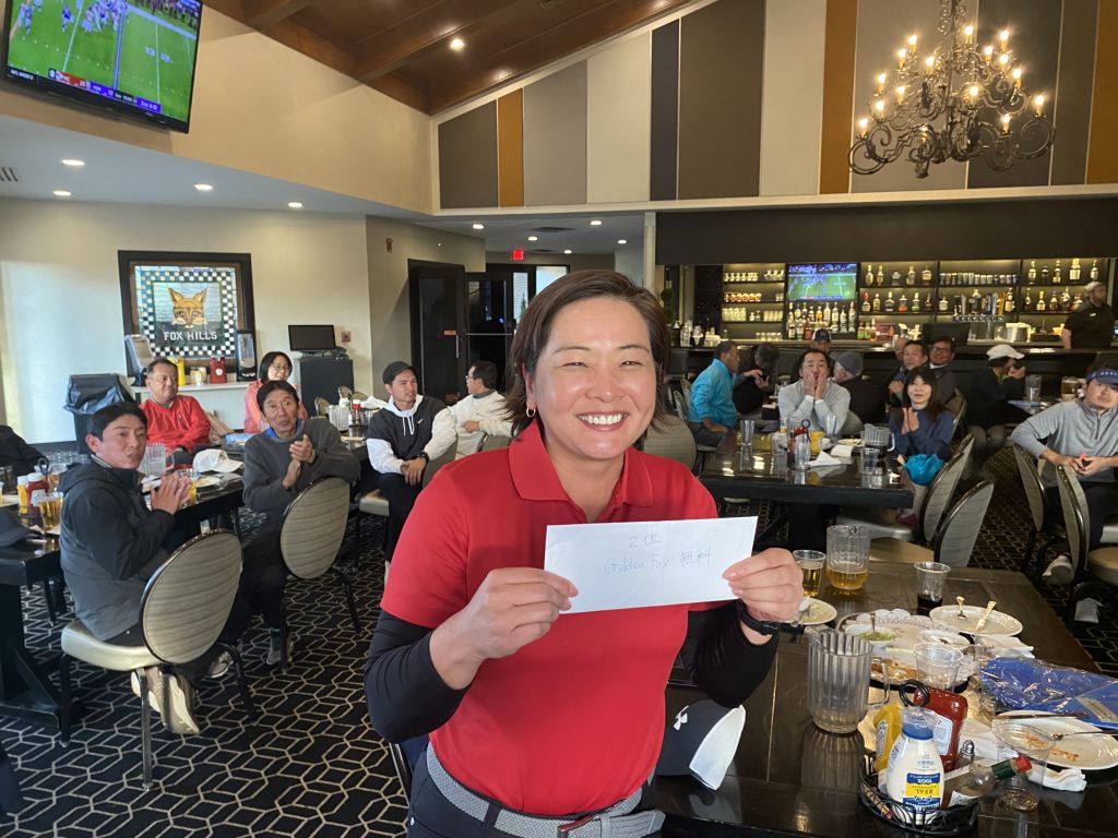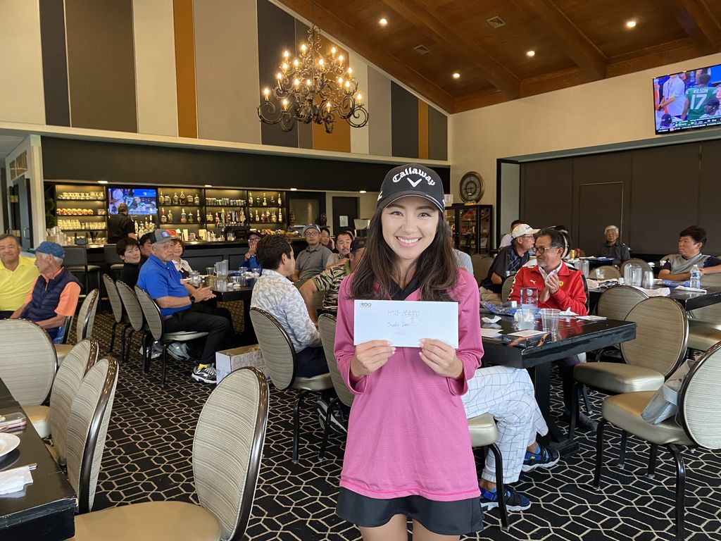 ![]() | 女性ドラコン賞とニアピン賞のW受賞、ゲスト参加の高橋さん 来年の活躍に期待です! |